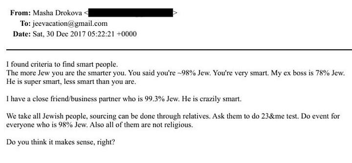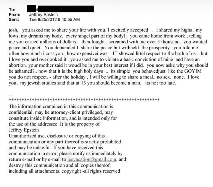 I ett mejl från 2009 skriver Epstein om hur “the jew” tjänar pengar på finansiella instrument medan “the goyim” får hantera den verkliga världen. I ett annat, från 2012, skäller han ut en bekant för att ha betett sig “just like the GOYIM you do not respect”. Mejlen mellan Epstein och PR-konsulten Peggy Siegel handlar om en fest: “Is it going to be 100% Jew night?” frågar hon. “No, goyim in abundance”, svarar han.